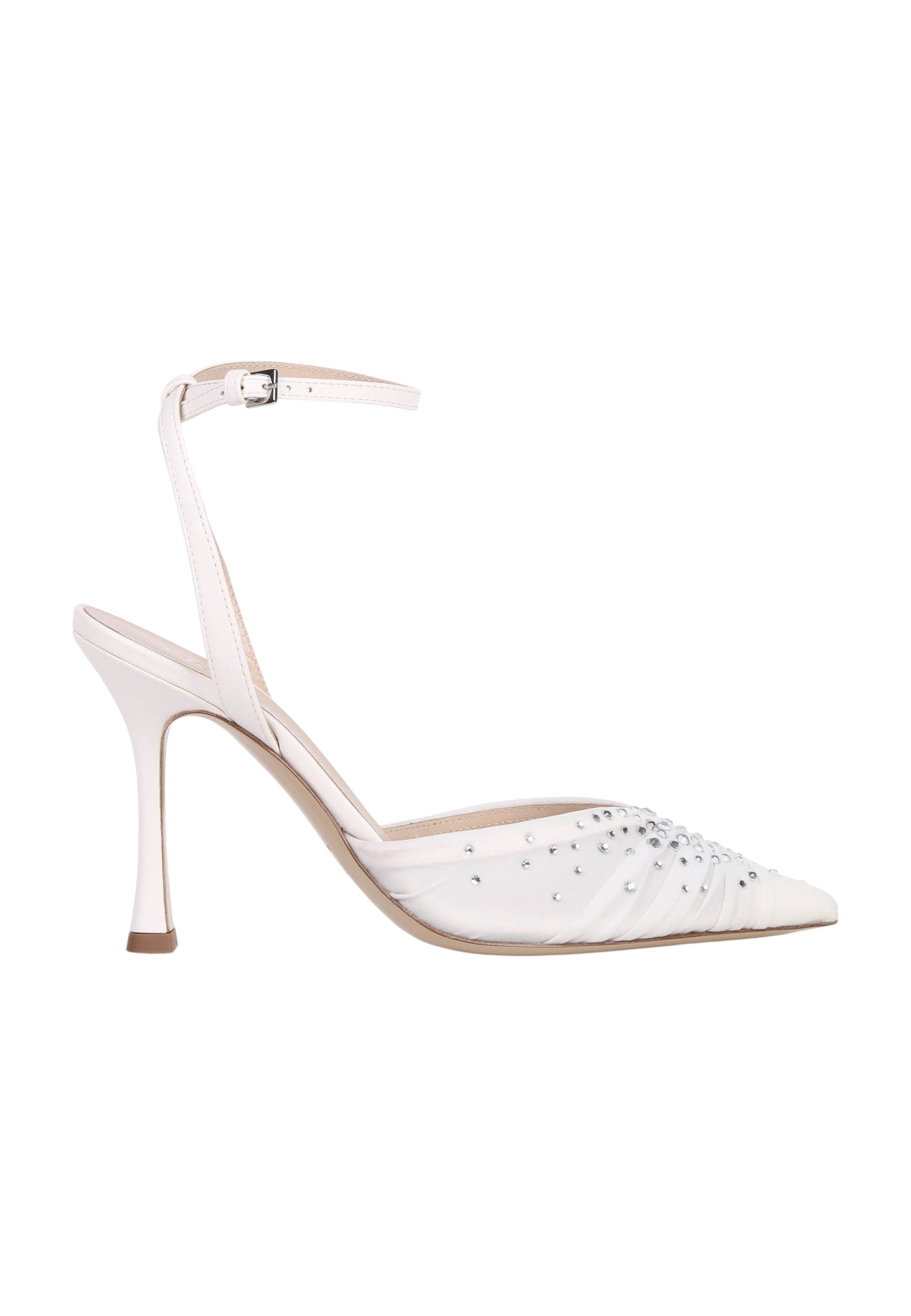Décolleté con cinturino alla caviglia, realizzata in tessuto e nappa con applicazione di strass. Scollo a punta. Suola in cuoio. Tacco 9,5 cm.